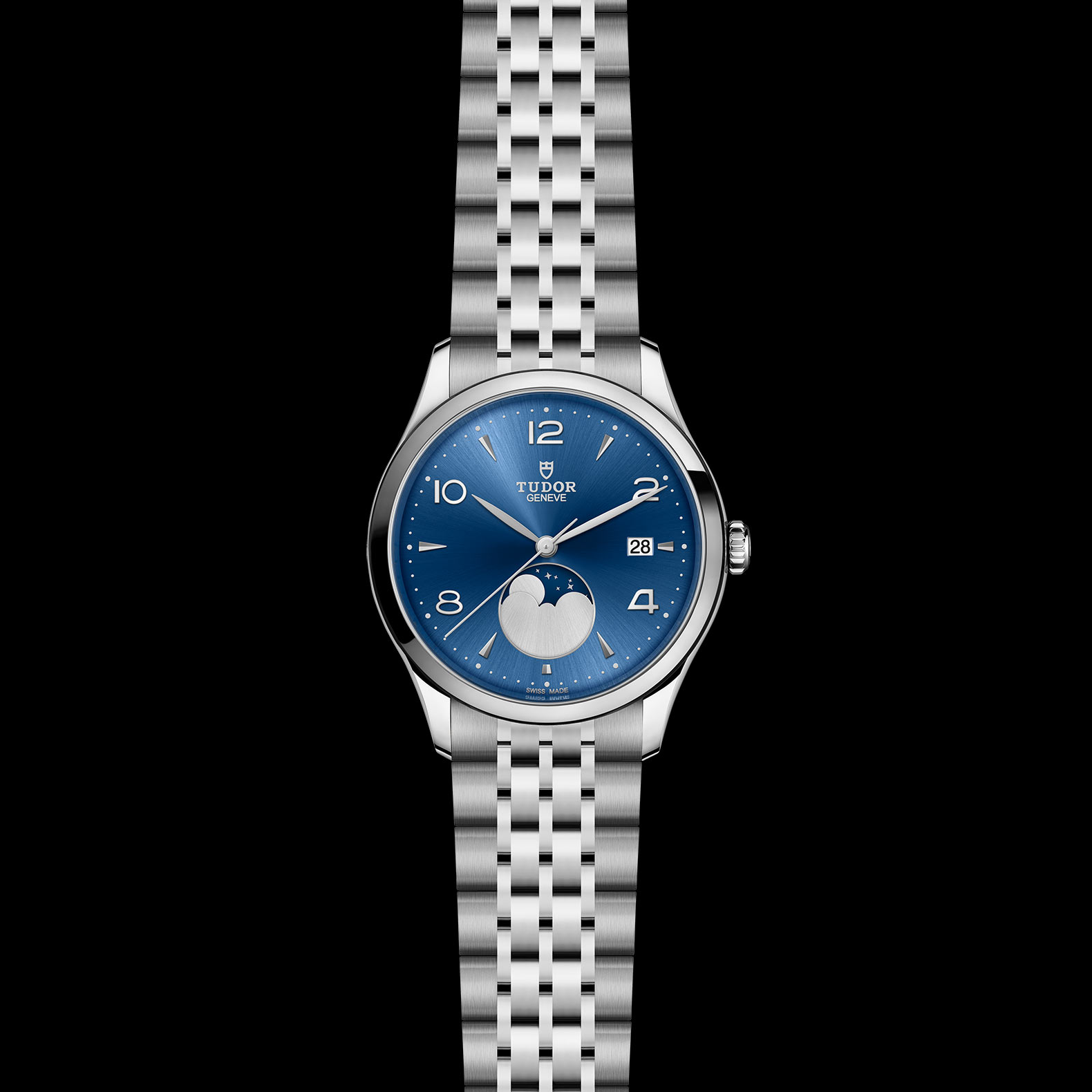 Dial: Blue satin sun-brushed dial with applied numerals and moon phase indicator